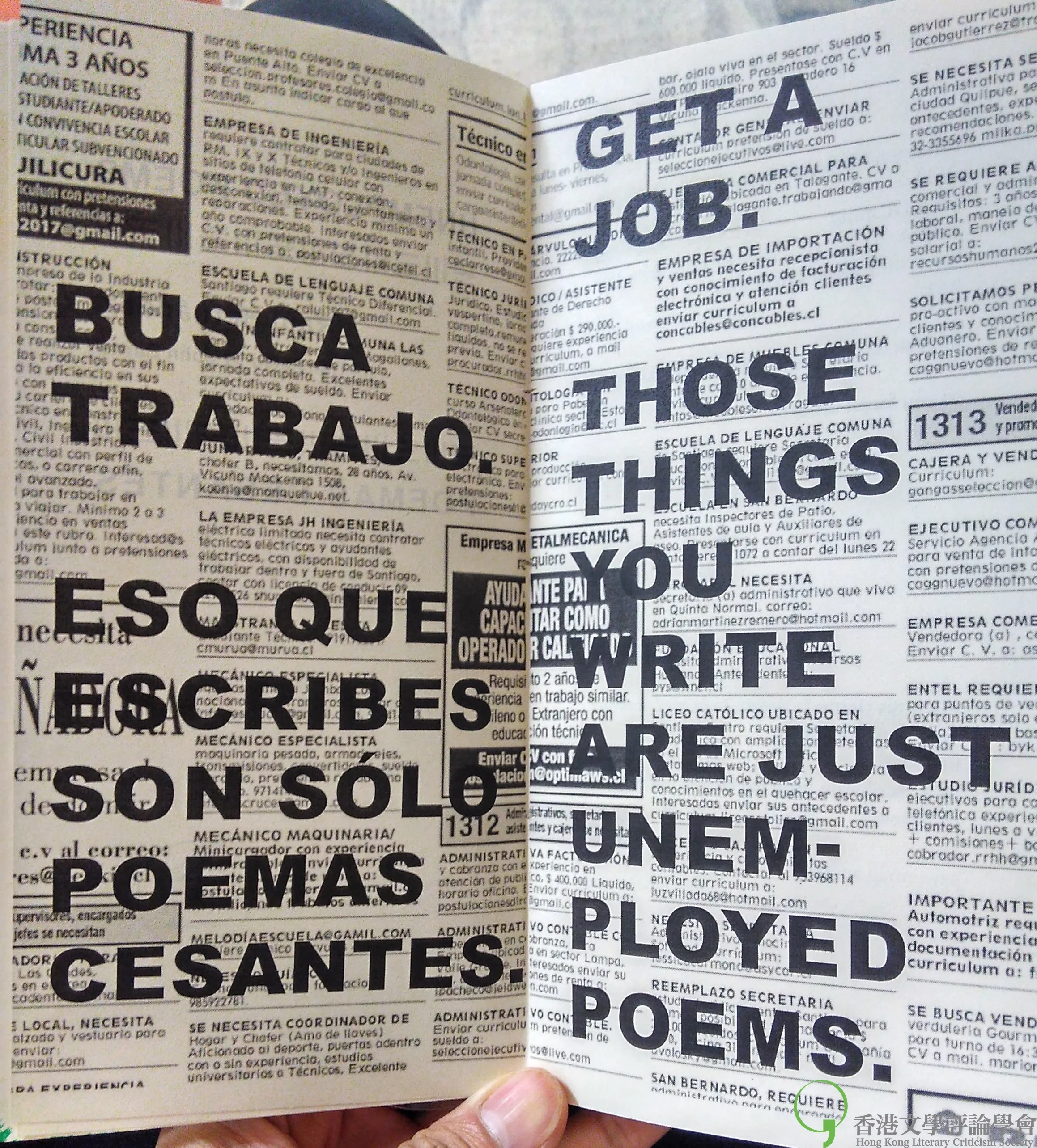 那天我看上一本以紙皮作封面封底,深具粗獷美感的輕盈詩集。「Get a job. Those things you write are just unemployed poems.」扉頁上一句諷刺得又痛又癢的說話,彷彿預先繞過了愛荷華的夢幻時光,教我想到回香港後須重新求職的現實。一股勁兒讀完智利詩人Raul Hernandez這本僅有五十頁的《Unemployed poems》,像撈獲了殊多像我一樣遊手好閒的生活片段。大概如詩集名字所強調,出於失業者賦閒的角度,冷觀智利低下層社會,當中不無黑色幽默: